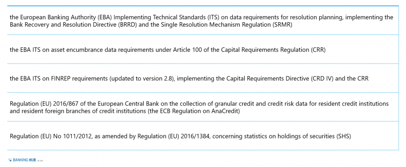 Die aktuelle, Ende 2019 veröffentlichte Version 5.0 von BIRD enthält eine überarbeitete Eingangsdatenschicht, welche über ihren erweiterten Datenumfang die Abbildung von „CoRep Credit Risk“ und „FinRep Non-Performing Loans and Securitisation“ ermöglicht. Damit enthält die Version 5.0 des Glossars die Datenanforderungen für folgende regulatorische Anforderungen[1]: