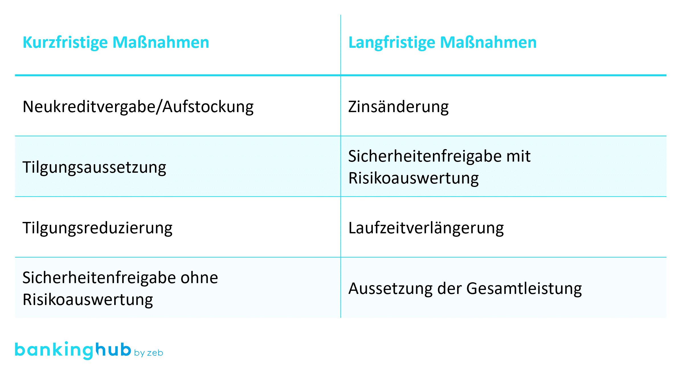Instituten stehen verschiedene Maßnahmen zur Verfügung, die sie ihren Kunden zusagen können. Dabei wird grundsätzlich zwischen kurzfristigen und langfristigen Maßnahmen unterschieden. Beispielhafte Maßnahmen sind in der folgenden Tabelle aufgeführt.
