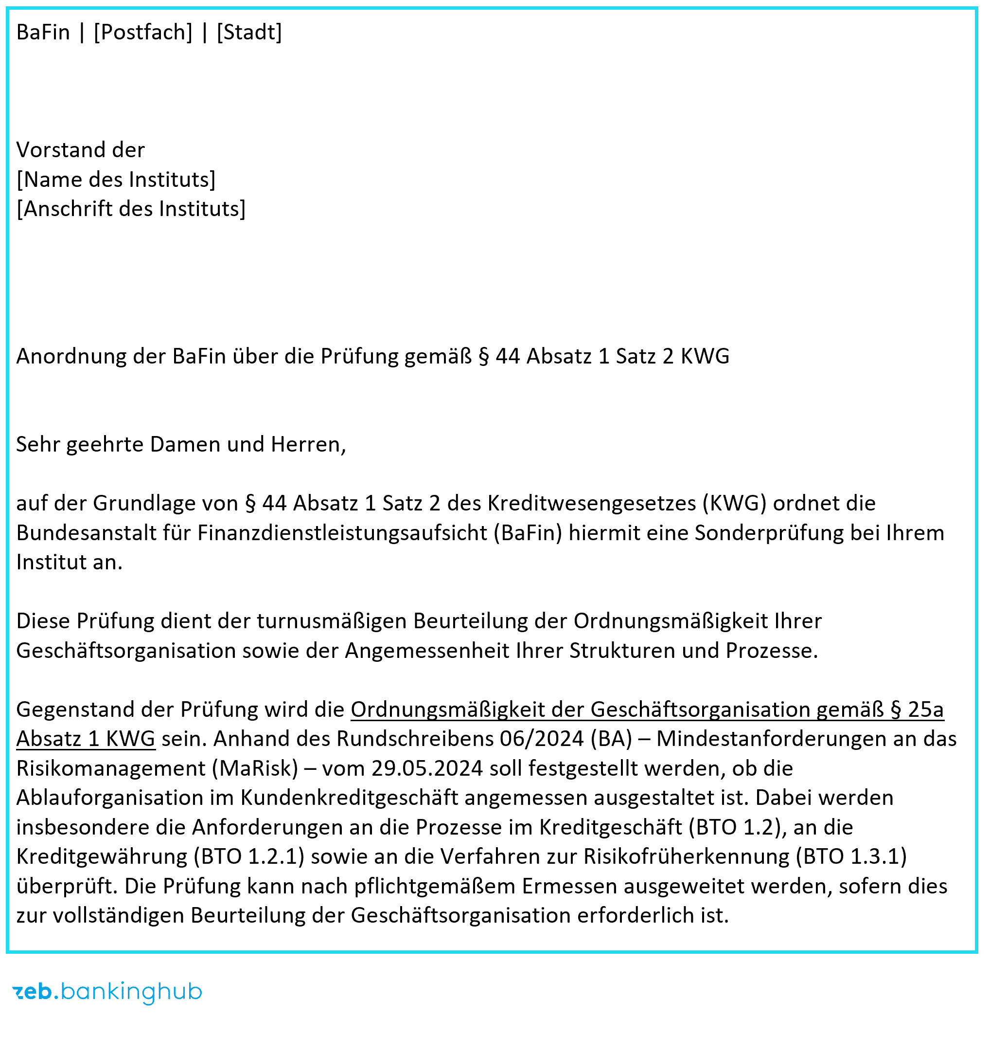- BaFin: Anordnung der Sonderprüfung, Definition von Umfang und Prüfungsschwerpunkten