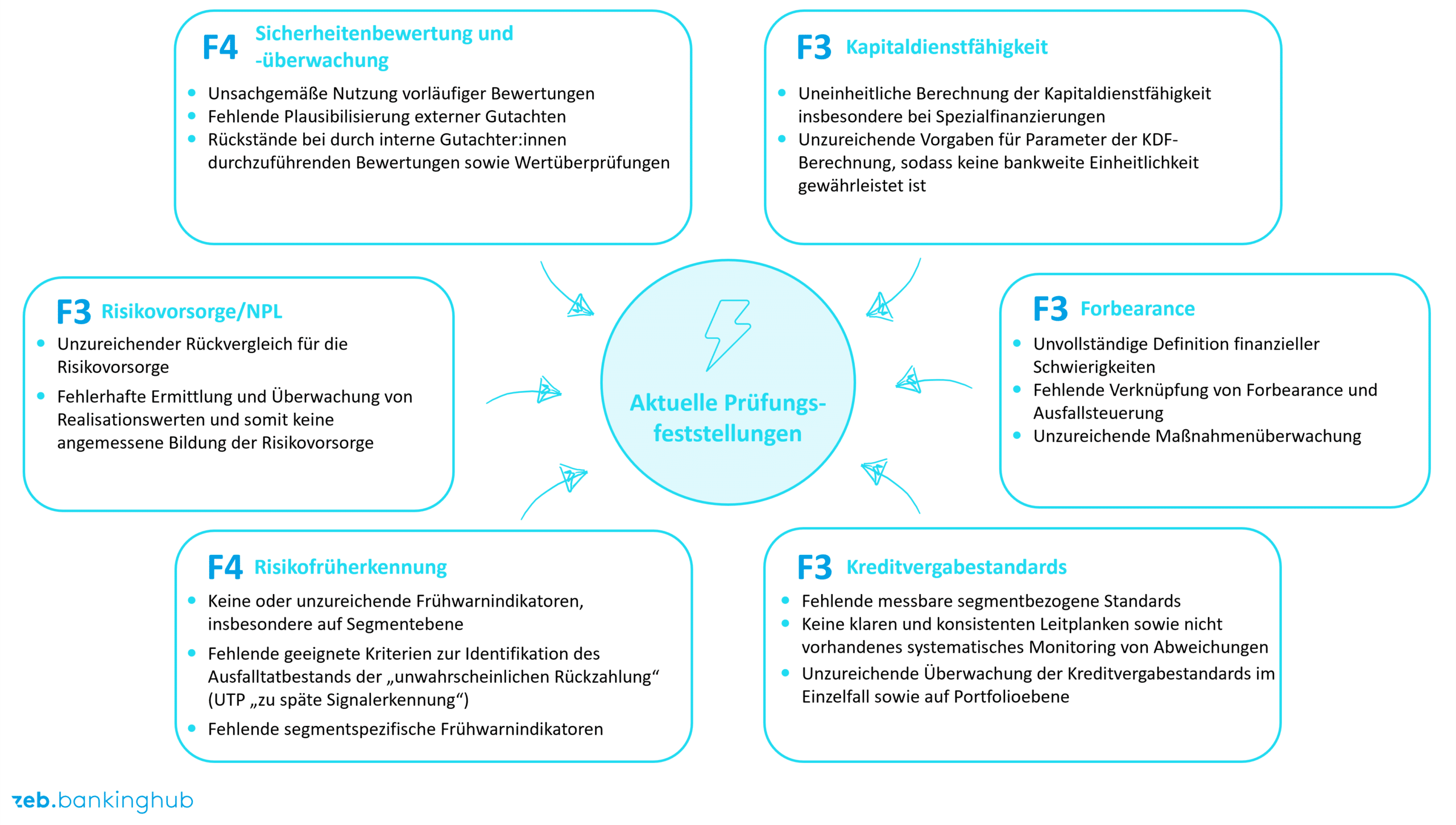 Bei aufsichtsrechtlichen Sonderprüfungen werden die Angemessenheit und Wirksamkeit der kreditbezogenen Prozesse vor allem anhand von Datenanalysen und Einzelengagementprüfungen bewertet. In der Prüfungspraxis zeigen sich klare, institutsübergreifende Muster bei wesentlichen Feststellungen (häufig F3/F4). Im Detail sind Regelwerke meist vorhanden, Defizite bestehen jedoch häufig in deren konsistenter Anwendung und Steuerung.