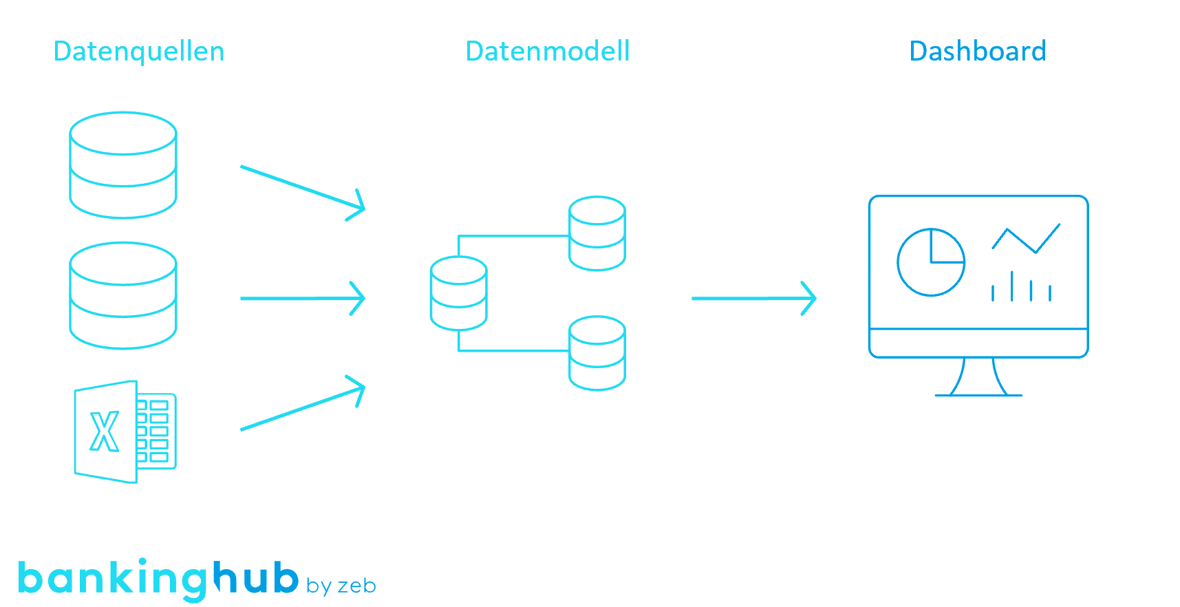 Zudem können Daten entlang dieser Dimensionen aggregiert, gefiltert und aufgeschlüsselt werden, beispielsweise nach Betrachtungszeitraum oder regionalen Aufgliederungen. Die Verknüpfung mehrerer Datenquellen zu einem Datenmodell und die Darstellung im Dashboard werden in Abbildung 1 skizziert.