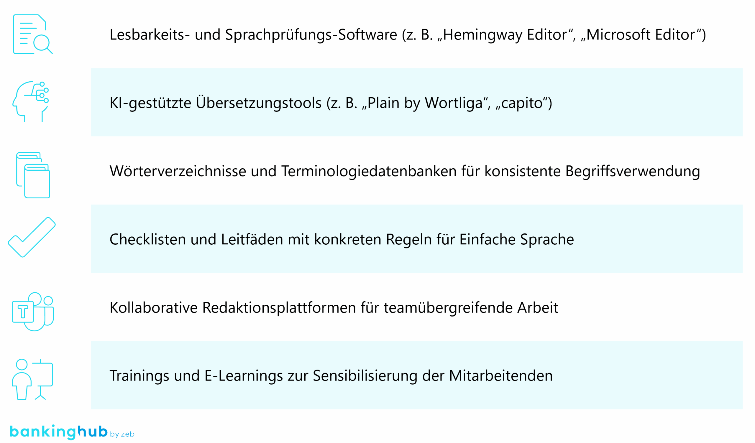 Im Folgenden finden Sie einige Best Practices – aufgeteilt in technische und sprachliche Tipps – die sich in der Praxis bewährt haben, um komplexe Inhalte verständlich aufzubereiten: