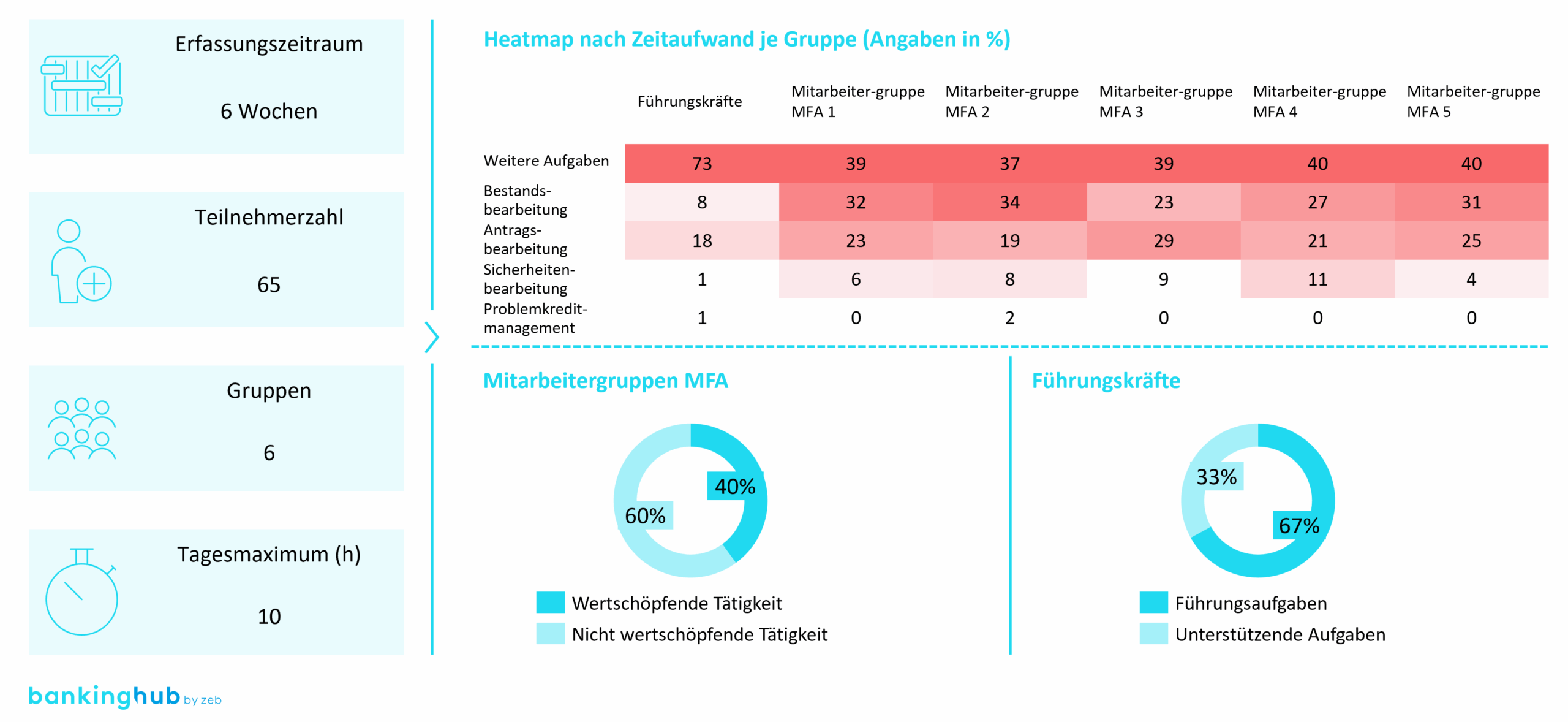 Die Weiterentwicklung der Marktfolge hin zu einem aktiven Wertbeitrag in Kreditprozessen erfordert mehr als punktuelle Maßnahmen – sie setzt ein tiefes Verständnis der tatsächlichen Prozessrealität voraus. Genau hier leistet die zeb.Zeitgewinnanalyse einen zentralen Beitrag: Sie schafft belastbare Transparenz über Zeitverwendung (wertschöpfende und nicht wertschöpfende Tätigkeiten) und organisatorische Reibungsverluste.