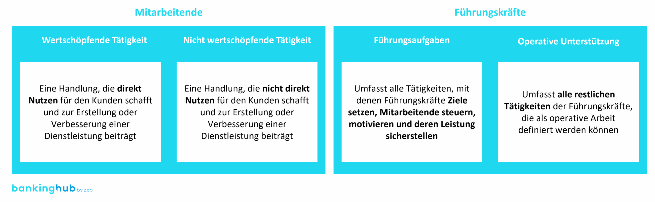 Dabei gilt ein zentraler methodischer Grundsatz: Die Erhebung ist ergebnisoffen und ausdrücklich nicht leistungsbezogen. Ziel ist es nicht, individuelle Leistungen zu bewerten, sondern strukturelle Transparenz über die tatsächliche Zeitverwendung zu schaffen. Dazu erfolgt eine differenzierte Betrachtung der Rollenprofile: Bei den Mitarbeitenden in der Marktfolge wird zwischen wertschöpfenden und nicht wertschöpfenden Tätigkeiten unterschieden, während bei den Führungskräften eine Abgrenzung zwischen Führungsaufgaben und operativer Unterstützung vorgenommen wird (siehe Abbildung 1).